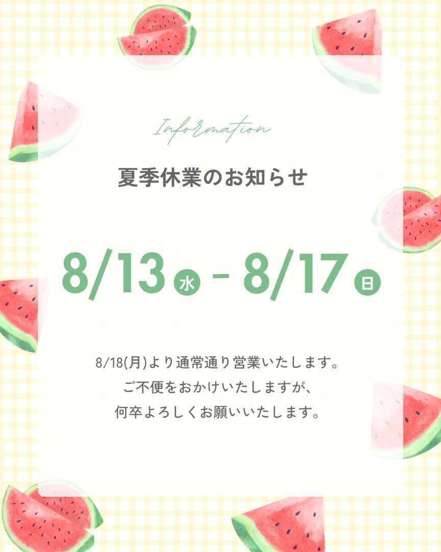 お盆休み中に頂いたお問合せについては、お盆休み期間終了後に順次回答させていただきます。